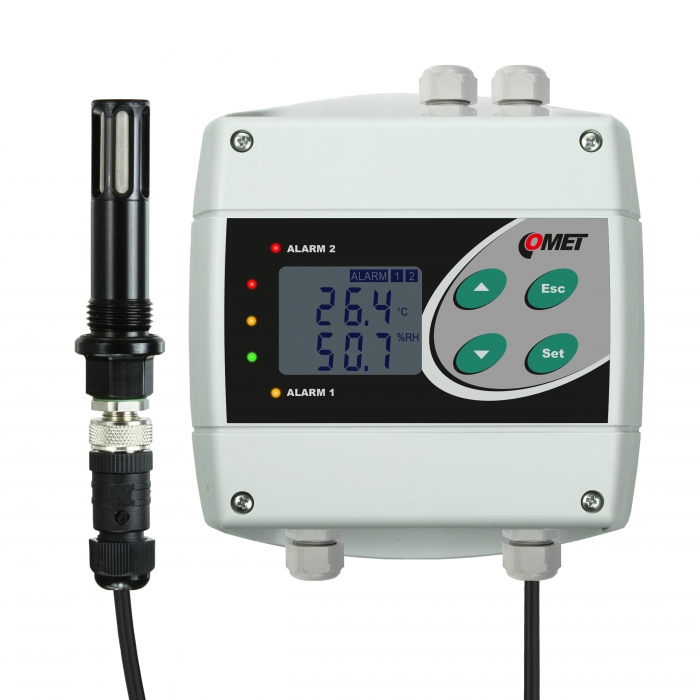 Humidistat, thermostat with two relay outputs. T+RH probe from hard anodized duralumin for compressed air up to 25 bars with 2 meters cable. Outdoor, indoor use.