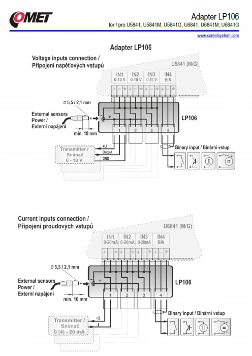 Adapter with terminals for easy connection of input signals, protection IP20. Designed for dataloggers U5841 (M/G), U6841 (M/G). Adapter enables to supply connected transducers e.g. from ac/dc adapter connected via power connector.