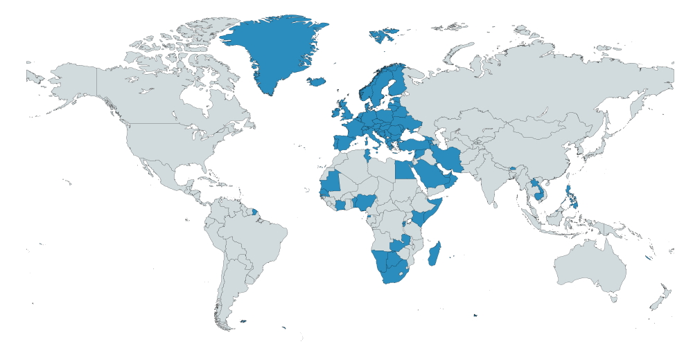 • Benin, Botswana, Burundi, Cabo Verde, Comoros, Côte d’Ivoire, Egypt, Equatorial Guinea, Kenya, Madagascar, Mauritania, Mayotte, Namibia, Nigeria, Reunion, Rwanda, Senegal, Somalia, South Africa, Tunisia, Zambia