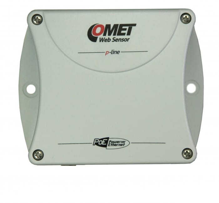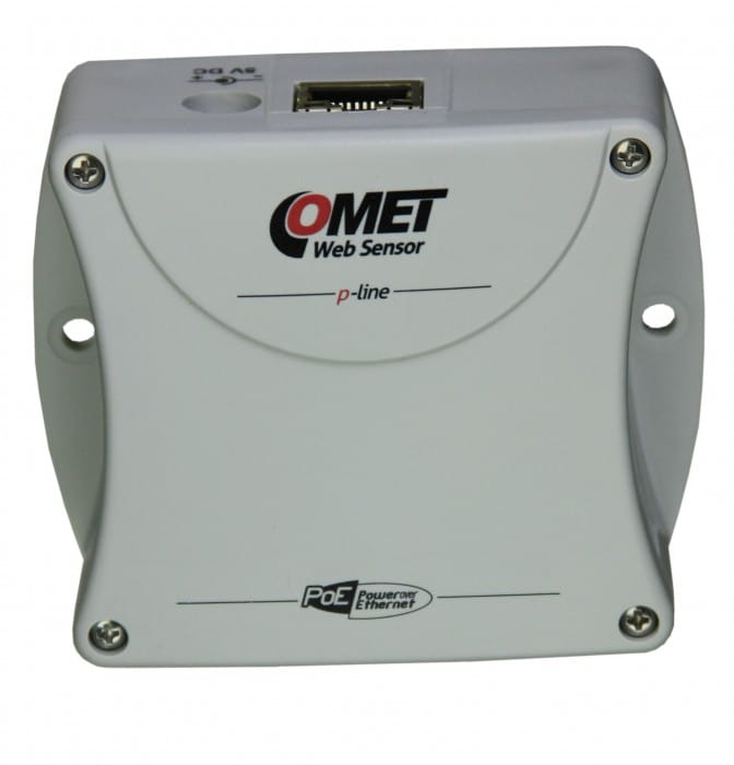 One channel p-line Web Sensor with PoE. Temperature or humidity + temperature probe is supported. Remote alarm.